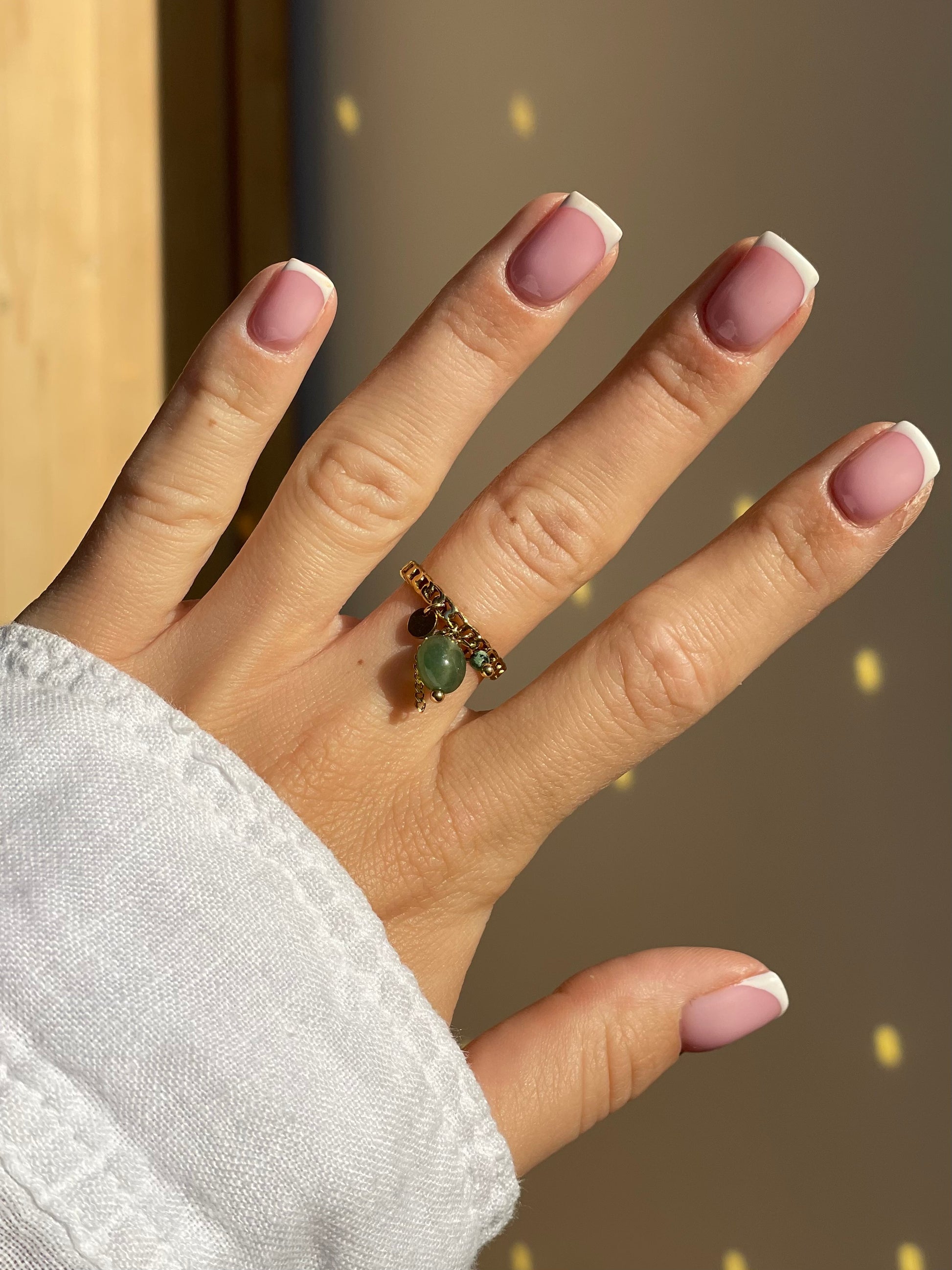 Bague fine en acier inoxydable composée d'un anneau style maille ajourée embelli par des breloques et pierres naturelles (jaspe vert).