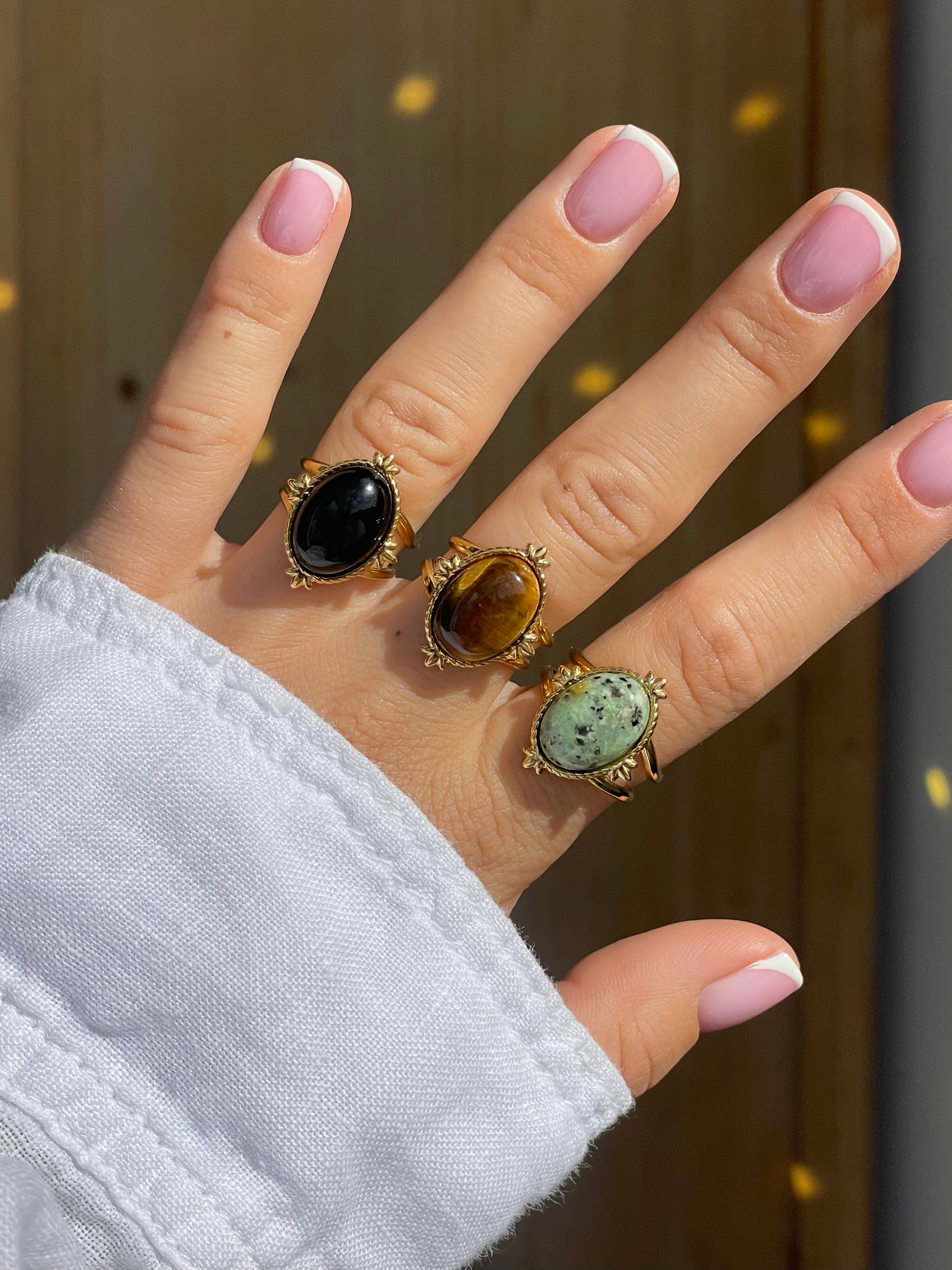 Bague en acier inoxydable et pierres naturelles (œil de tigre, turquoise africaine et agathe noir)